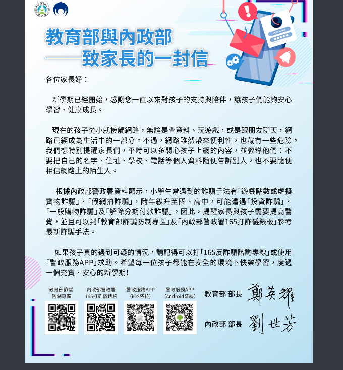 教育部與內政部共同製作「致家長的一封信」,提醒家長注意小學生及中學生常見詐騙手法