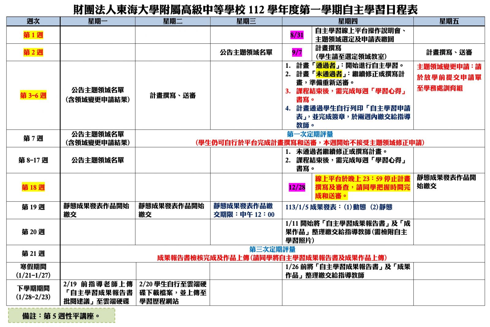 112學年度第一學期自主學習日程表